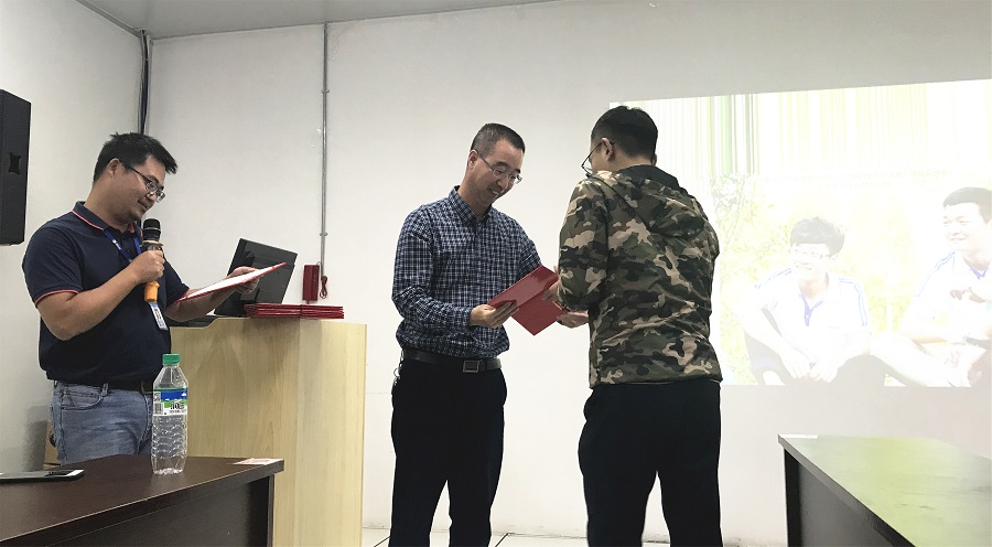在实习中,南昌理工学院的实习生渐入佳境,涌现出了一批佼佼者。为树立学习榜样,鼓励大家更加努力工作,神奇人资与生产部门选出卢亚楠、韦德格等10位优秀员工晋升为代理班长,并对其进行了表彰。神奇工场总裁孟锴为优秀学员颁发了荣誉证书。